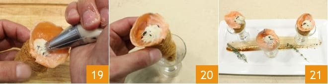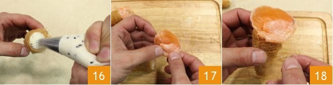 pressez une touffe de crème à l'intérieur de chaque mini croissant 16, reprenez les tranches de saumon roulez-les pour former des pétales 17, appliquez un pétale sur chaque croissant 18,