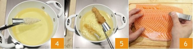 badigeonnez la pâte avec l'œuf battu 4. Faites frire dans de l'huile de graines chaude à 170°C (pour une cuisson optimale, utilisez un thermomètre alimentaire), jusqu'à coloration dorée (cela prendra environ 3 minutes), puis égouttez les croissants à l'aide d'une pince de cuisine 5 et placez-les à sécher sur un plateau recouvert de papier absorbant. Occupez-vous du saumon, si vous êtes sûr d'avoir acheté du saumon norvégien, il ne serait pas nécessaire de prendre d'autres précautions. Sinon, assurez-vous d'avoir acheté du poisson abattu et congelez-le pendant au moins 96 heures à -18 degrés avant de l'utiliser dans la recette : éliminez les arêtes avec une pince spéciale 6