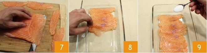prélevez du filet 8 tranches en coupant en diagonale 7, déposez les tranches dans un grand plat sans les superposer 8 et saupoudrez de sel et de sucre sur la surface 9