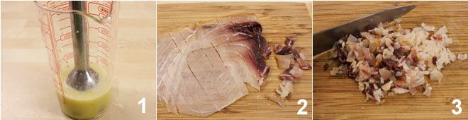 Pour préparer les galettes, commencez par la citronnette : pressez le citron et versez-le dans un récipient haut et étroit, ajoutez l'huile, le sel et le poivre, et à l'aide d'un mixeur plongeant, mixez la sauce pour obtenir votre citronnette. Puis, occupez-vous du poisson : placez les tranches d'espadon fumé sur une planche à découper et coupez-les au couteau pour obtenir un tartare.