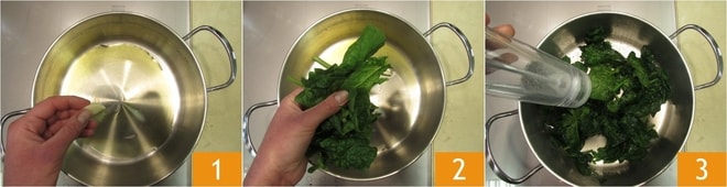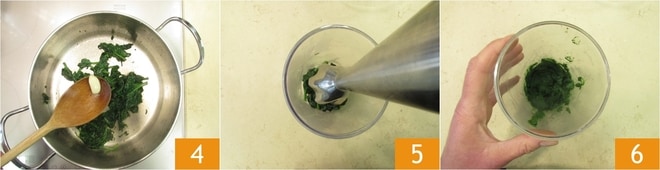 Faites cuire pendant 5 minutes à feu vif en remuant, jusqu'à ce qu'ils soient flétris. Retirez l'ail 4, transférez les épinards cuits dans un verre haut et mixez avec un mixeur plongeant 5. Réservez la crème obtenue 6.