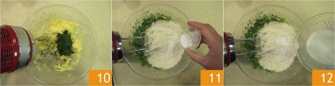 Ajoutez également les épinards mixés dans le bol 10, travaillez rapidement avec le batteur et ajoutez la farine, la levure instantanée et le lait 12.