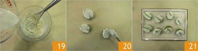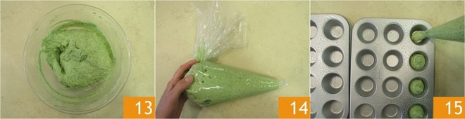 Travaillez avec le batteur jusqu'à obtenir une pâte homogène 13. Transférez la pâte dans une poche à douille sans embout 14 et remplissez un moule à 12 mini muffins 15, avec ces doses vous obtiendrez 36 muffins. Faites cuire dans un four statique préchauffé à 180° pendant 20 minutes.