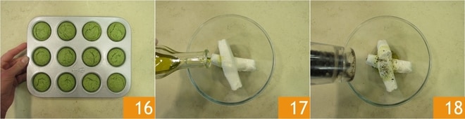 Une fois cuits, sortez les muffins du four et laissez-les refroidir 16. En attendant, préparez la crème de chèvre en versant dans un bol le fromage, un filet d'huile 17, du sel et du poivre 18.