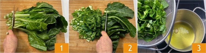 Pour réaliser les mini pasqualine en pâte phyllo, commencez par les herbes : enlevez la base 1 et coupez-les grossièrement 2, puis mettez-les dans une grande casserole où vous aurez fait chauffer l'huile avec une gousse d'ail 3.