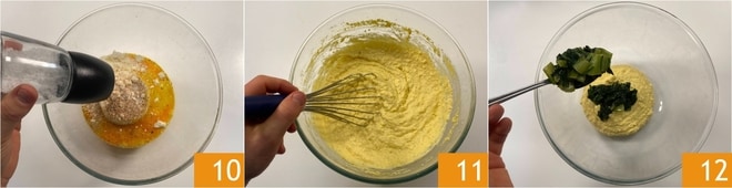 Salez 10 et poivrez, puis mélangez le tout avec un fouet. Enfin, ajoutez les herbes bien égouttées 12 et mélangez pour les incorporer de manière homogène.