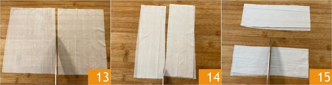 Maintenant, occupez-vous des paniers en pâte phyllo : prenez une feuille de pâte phyllo et coupez-la en deux 13, puis superposez les rectangles obtenus et coupez-les encore en deux dans la longueur 14. Divisez les bandes encore une fois en deux pour obtenir 8 petits rectangles par feuille de pâte phyllo. Continuez ainsi avec toutes les autres feuilles 15.