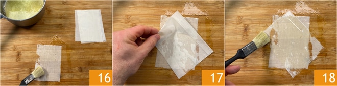 Placez un petit rectangle sur le plan de travail et badigeonnez-le légèrement de beurre fondu 16. Superposez un deuxième petit rectangle en diagonale 17 et badigeonnez-le aussi 18.