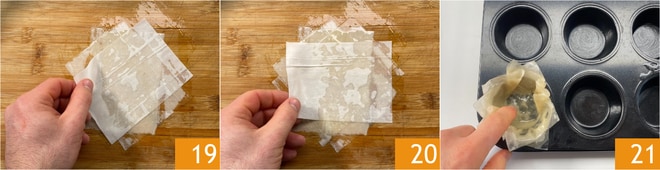 Disposez le troisième petit rectangle toujours en diagonale mais dans le sens opposé 19 et badigeonnez également celui-ci. Enfin, posez le quatrième petit rectangle transversalement par rapport au premier 20 et badigeonnez encore. Transférez le tout dans un moule à muffins que vous aurez préalablement beurré et appuyez pour lui donner la forme d'un panier 21. Continuez ainsi pour réaliser tous les paniers, il vous faudra 4 petits rectangles pour chacun : n'oubliez pas de beurrer chaque couche.