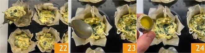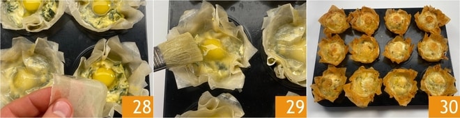 Posez les couvercles ainsi formés sur la garniture de chaque panier 28 et badigeonnez légèrement la surface 29. Faites cuire au four statique préchauffé à 200°C pendant environ 20 minutes, puis activez le gril à 220°C et poursuivez la cuisson pendant 10 minutes jusqu'à ce qu'ils soient dorés. Sortez du four et servez vos mini pasqualine en pâte phyllo chaudes ou à température ambiante 30 !
