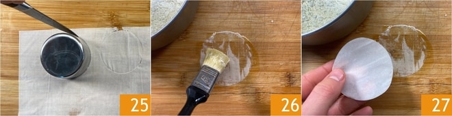 À ce stade, créez les couvercles pour les paniers : découpez les petits rectangles restants de pâte phyllo avec un emporte-pièce d'un diamètre légèrement inférieur à celui du moule à muffins 25. Superposez 2 petits cercles de pâte phyllo pour chaque panier, en les badigeonnant toujours avec un peu de beurre fondu 26 27.
