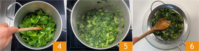 Faites revenir à feu vif pendant quelques minutes 4, puis baissez légèrement le feu, couvrez et laissez cuire environ 15 minutes. À la fin de la cuisson, le fond doit être presque sec 5, mais pour plus de sécurité, mettez les herbes dans une passoire et pressez-les pour éliminer l'excès de liquide 6. Laissez tiédir.