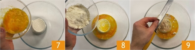 En attendant, préparez la farce : mettez les œufs battus dans un bol où vous aurez mis la ricotta 7, puis ajoutez le Parmesan Reggiano AOP râpé 8 et la muscade 9.