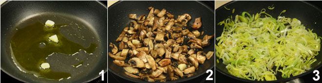Pour préparer les mini quiches aux champignons, poireaux et jambon cuit, commencez par nettoyer et couper en morceaux les champignons de Paris ; faites dorer une gousse d'ail dans une poêle antiadhésive avec deux cuillères à soupe d'huile 1 et faites cuire les champignons en morceaux 2, salez et poivrez. Pendant ce temps, dans une autre poêle avec une cuillère à soupe d'huile, faites cuire les poireaux nettoyés et coupés finement pendant environ 15/20 minutes 3