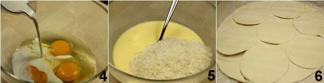 Dans un bol, battez 4 œufs avec la crème 4, mélangez bien et incorporez le Grana Padano 5, ajustez ensuite le sel et le poivre. Beurrez 14 moules de cuisson d'un diamètre d'environ 8 cm, ou des moules à muffins (dans ce cas, les mini quiches seront encore plus petites) et découpez la pâte feuilletée en cercles d'un diamètre de quelques centimètres plus large que vos moules, en vous aidant d'un verre ou d'une petite tasse 6.