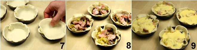 Enfin, tapissez les moules avec les disques de pâte feuilletée 7 et commencez à les garnir. Ajoutez dans chaque quiche le mélange de champignons et poireaux, le jambon cuit coupé en petits morceaux 8 et versez par-dessus le liquide d'œufs, crème et Grana Padano jusqu'à les remplir 9. Les quiches seront ensuite enfournées à 180°C (four ventilé) pendant environ 20 minutes, jusqu'à ce qu'elles aient une belle apparence dorée. Servez les mini quiches aux champignons, poireaux et jambon bien chaudes !