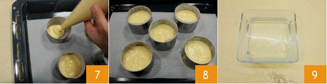 Puis, déposez sur une plaque recouverte de papier sulfurisé 5 cercles en acier d'un diamètre de 7,5 cm et d'une hauteur de 4,5 cm. Chemisez chaque cercle avec une bande de papier sulfurisé d'environ 5 cm de hauteur. Ensuite, remplissez chaque cercle aux ¾ environ avec le mélange monté (7-8). Faites cuire les biscuits dans un four statique préchauffé à 175° pendant 35 minutes (si four ventilé à 155° pendant environ 25 minutes, vérifiez avec un cure-dent si l'intérieur est sec avant de les sortir). Lorsqu'ils sont prêts, sortez-les et laissez-les tiédir. Entre-temps, préparez le glaçage : mettez les feuilles de gélatine à ramollir dans de l'eau froide pendant au moins 10 minutes 9.