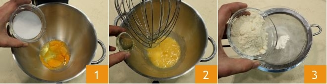 Pour préparer la mini sacher blanche aux amandes, commencez par la pâte du biscuit : dans le bol d'un robot culinaire équipé d'un fouet (vous pouvez également utiliser un batteur électrique), versez les œufs et le sucre 1, ajoutez aussi le miel 2 et commencez à travailler le tout pour obtenir un mélange clair et mousseux. Tamisez les farines 3