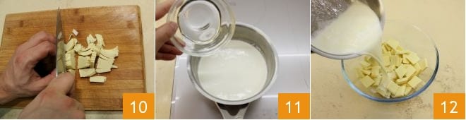 Hachez grossièrement le chocolat 10 et placez-le dans un bol, puis versez la crème dans une casserole et ajoutez le glucose 11, mélangez et amenez à frémir. Versez la crème sur le chocolat blanc 12 et mélangez pour le faire fondre, puis ajoutez les feuilles de gélatine bien essorées et mélangez pour les faire fondre complètement.