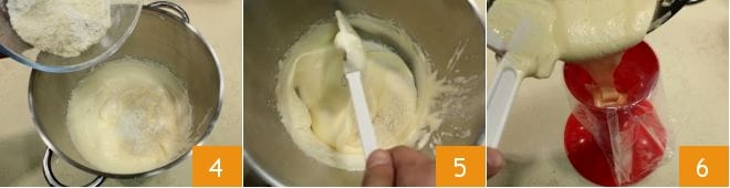 puis versez-les dans le robot 4 et mélangez avec une spatule en effectuant un mouvement du bas vers le haut 5. Lorsque le mélange est bien homogène, transférez-le dans une poche à douille 6.