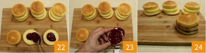 Garnissez le disque inférieur avec une cuillère de confiture 22, continuez avec un autre disque de biscuit et garnissez-le 23 ; puis déposez un autre disque pour compléter les petits gâteaux 24.