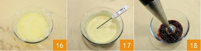 Couvrez d'un film plastique au contact et mettez de côté 16 : pour une densité parfaite, mesurez la température du glaçage avec un thermomètre alimentaire 17 : il doit atteindre 30-32° ; s'il devient trop froid, il suffit de le réchauffer quelques secondes au micro-ondes. Avec un mixeur plongeant, mixez la confiture de fruits rouges 18