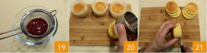 et passez-la au tamis 19. Ensuite, reprenez les biscuits, retirez-les des cercles avec le papier sulfurisé 20 et divisez-les en 3 parties 21 de sorte que chaque petit gâteau soit composé de trois disques.