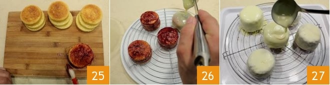Badigeonnez les petits gâteaux avec le reste de la confiture de fruits rouges 25 et placez-les au réfrigérateur pour raffermir pendant au moins 20 minutes. Ensuite, placez les petits gâteaux sur une grille posée sur un plateau et recouvrez-les d'une première couche de glaçage au chocolat blanc 26. Remettez les petits gâteaux au réfrigérateur pendant 5 minutes, puis répétez la même opération avec le glaçage 27 et remettez-les au réfrigérateur. La mini sacher blanche aux amandes est prête à être servie comme un délicieux dessert !