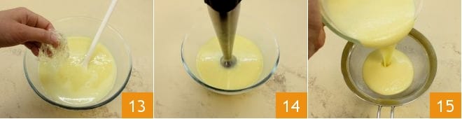 puis ajoutez les feuilles de gélatine bien essorées 13 (vous pouvez également procéder ainsi : réservez 2 cuillères à soupe de crème chauffée et dissolvez la gélatine d'abord dans la crème chaude avant de l'ajouter au reste du glaçage) ; mélangez pour la faire fondre complètement. Mixez avec un mixeur plongeant pendant quelques secondes 14 et, éventuellement, passez la crème au tamis si nécessaire pour éliminer les grumeaux 15.