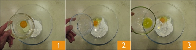 Pour préparer les Mini strudels salés aux artichauts, pommes de terre et speck, commencez par la pâte à strudel : dans un bol, versez la farine, l'œuf 1, l'eau 2, l'huile 3 et une pincée de sel.