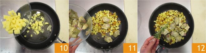 Ajoutez les pommes de terre 10 et faites cuire pendant 5 minutes. Puis incorporez aussi les artichauts 11 et assaisonnez avec le romarin 12.