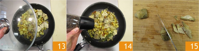 Couvrez avec le couvercle 13 et faites cuire pendant 10 minutes à feu doux. Salez et poivrez 14. Émincez finement les artichauts 15.