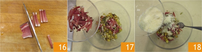 Coupez le speck en lanières 16. Dans un bol, versez les légumes sautés, le speck 17 et le fromage râpé 18.