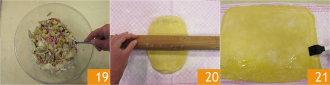 Mélangez pour bien incorporer 19. Étalez la boule sur un torchon d'abord avec un rouleau à pâtisserie puis à l'aide des mains pour l'étirer afin qu'elle soit très fine 20. Badigeonnez la surface avec l'huile 21.