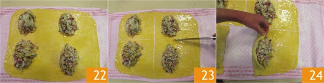 Disposez la farce aux 4 angles 22, puis découpez 4 rectangles autour de la farce 23. Repliez un bord de pâte 24.