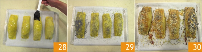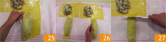 Jusqu'à envelopper toute la farce 25, pour créer un petit paquet 26. Coupez l'excédent de pâte sur les bords et pressez pour sceller 27.