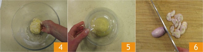 Pétrissez à la main jusqu'à obtenir une boule homogène 4, puis transférez-la sur le plan de travail, couvrez-la avec le même bol et laissez-la reposer 30 minutes à température ambiante 5. Épluchez et émincez l'échalote 6.
