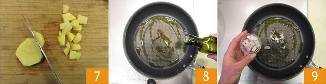 Épluchez et coupez les pommes de terre en petits cubes de 1 cm 7. Dans une poêle, versez un filet d'huile 8, ajoutez l'échalote 9, faites-la revenir 2/3 minutes.