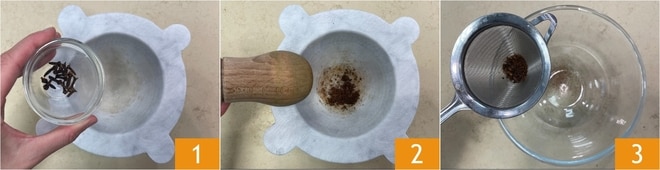 Pour réaliser les mini tarte tatin de petits oignons, commencez par mettre les clous de girofle dans un mortier 1 et écrasez-les avec un pilon jusqu'à les réduire en poudre 2. Tamisez la poudre obtenue et réservez 3.
