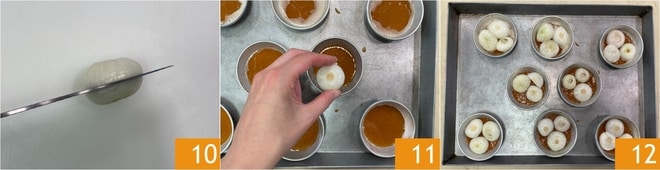 À ce stade, divisez les petits oignons horizontalement en deux 10 et placez-les sur le caramel, côté coupé vers le bas 11. Utilisez 3 morceaux pour chaque moule 12.