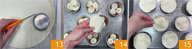 Maintenant, déroulez la pâte feuilletée et découpez des disques de la même taille que la base du moule 13. Posez le disque de pâte sur les petits oignons 14 et repliez les bords pour sceller les côtés 15.