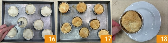 Piquez la pâte avec une fourchette 16 et faites cuire dans un four statique préchauffé à 180° pendant environ 30 minutes. Une fois dorées en surface, sortez les mini tarte tatin du four et laissez-les tiédir 17, puis renversez-les délicatement sur une assiette 18.