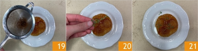 Garnissez avec la poudre de clous de girofle réservée 19 et quelques feuilles de thym frais 20. Vos mini tarte tatin de petits oignons sont prêtes à être servies 21 !