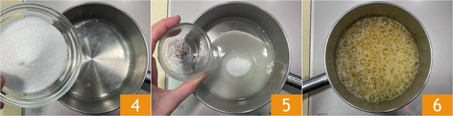 Passez à la préparation du caramel : dans une petite casserole, versez l'eau, le sucre 4 et la poudre de clous de girofle, en conservant une petite partie pour la garniture 5. Portez à ébullition à feu moyen-doux 6.