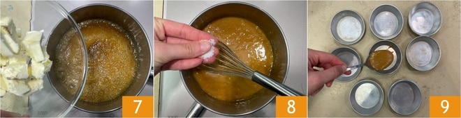 Quand le caramel aura atteint 180° et une couleur ambrée, éteignez le feu et ajoutez le beurre en dés 7. Mélangez bien avec un fouet, puis ajoutez le sel 8 et mélangez à nouveau. Versez le caramel encore chaud au fond de 8 moules en aluminium d'un diamètre de 8 cm 9, puis placez-les sur une plaque.
