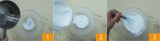 Pour préparer les mochi, commencez par chauffer l'eau dans une petite casserole et versez-la bouillante sur le sucre 1. Ajoutez la farine de riz 2 et mélangez avec un fouet 3.