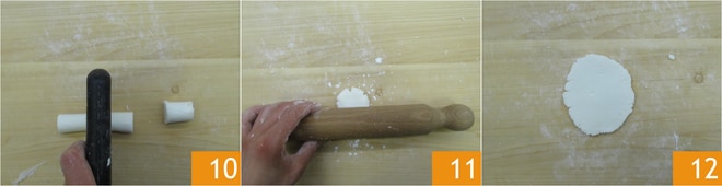 Découpez des morceaux 10. Étalez la pâte avec un rouleau à pâtisserie 11 pour créer de petits disques 12.