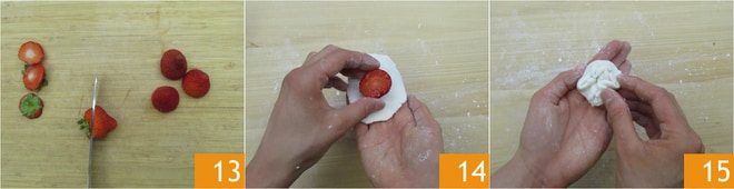 Lavez et séchez les fraises, puis retirez-en la tige 13. Enveloppez la fraise avec le disque de pâte 14 et refermez l'extrémité 15.