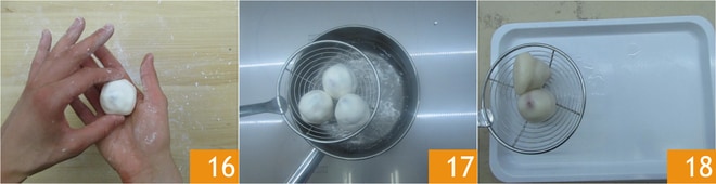 Vous devez obtenir une sorte de cône qui reprend la forme de la fraise 16. Faites bouillir les Mochi 17 pendant quelques minutes jusqu'à ce qu'ils remontent à la surface 18.