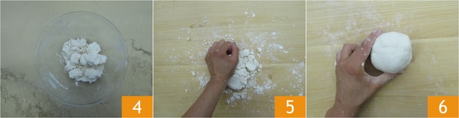 Une fois les ingrédients rassemblés 4, transférez la pâte sur un plan de travail et pétrissez-la 5 jusqu'à former une boule homogène 6.